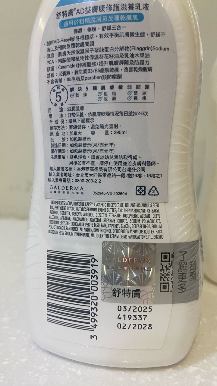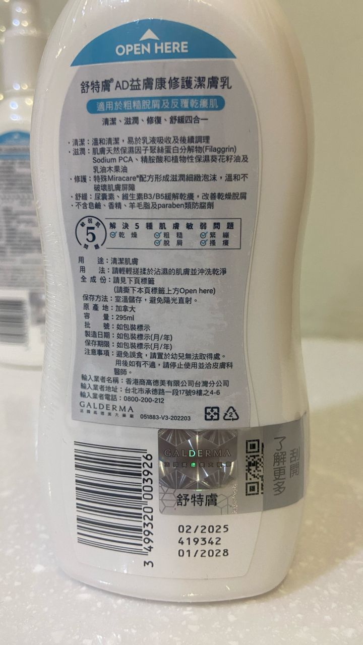 商品名稱:舒特膚 AD益膚康修護滋養乳液 & 潔膚乳