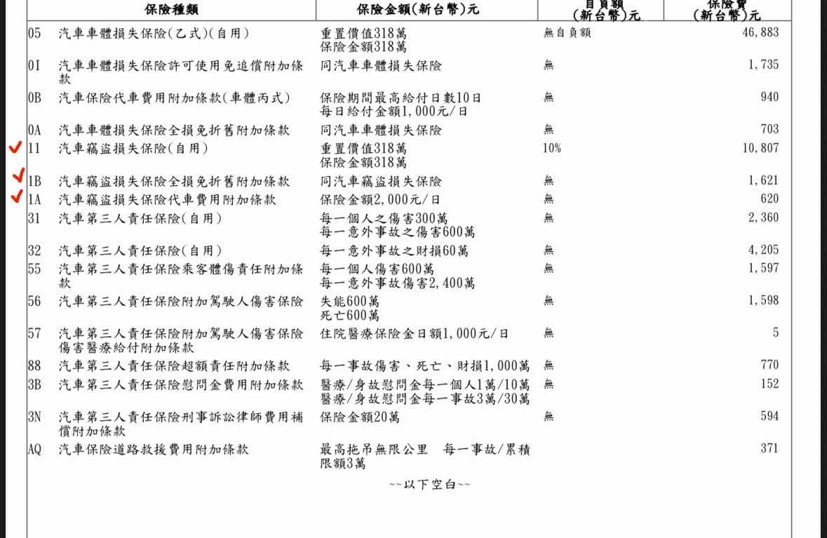 → lmanaka: 竊盜可以拿掉,免追償可以留著,可加訴訟險還有免折舊03/29 10:51